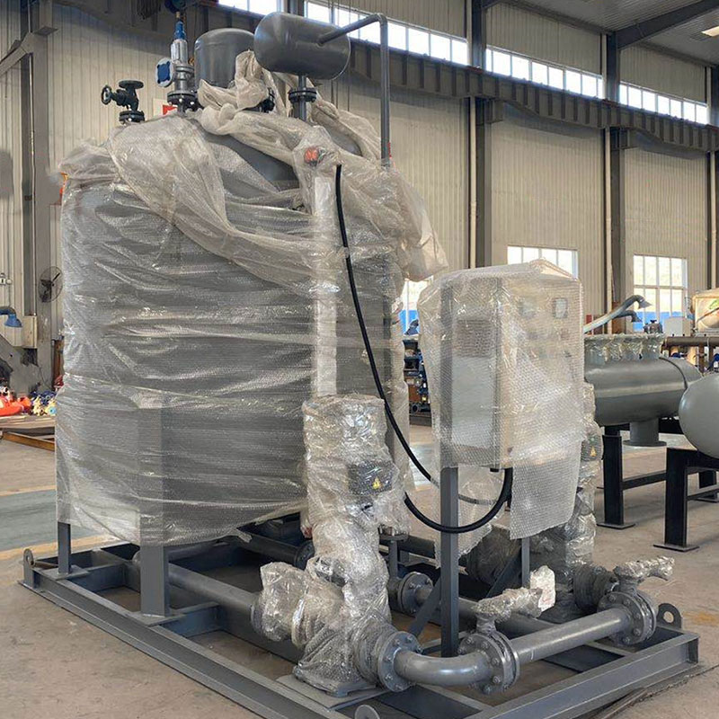 本设备是根据汽水两相流动的特点及饱和水的特性,使高温冷凝水先进入闪蒸罐,释放出二次蒸汽,然后液态冷凝水在重力作用下进入集水罐,通过积水罐汽水分离装置再次对汽水进行分离,保证进入积水罐的冷凝水均为液态,在恒压系统及气蚀消除装置的调整使凝结水泵入口处始终为单相的液态水,从而消除了水泵的气蚀问题。设备具有完备的启动、停止、自动手动切换及报警功能。根据生产实际要求,利用液位自动控制系统对冷凝水回收器内的冷凝水进行合理的调配,使得生产工艺设备以及凝结水系统安全平稳的运行。